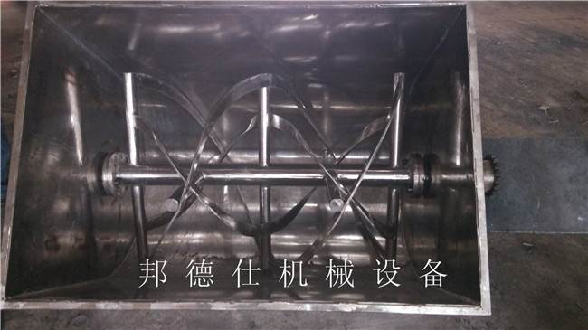 2.双螺带混合机是高效且普遍用到的单轴搅拌机。半开管状筒的主轴上以一定百分比缠有蜗牛状的双层螺旋带。