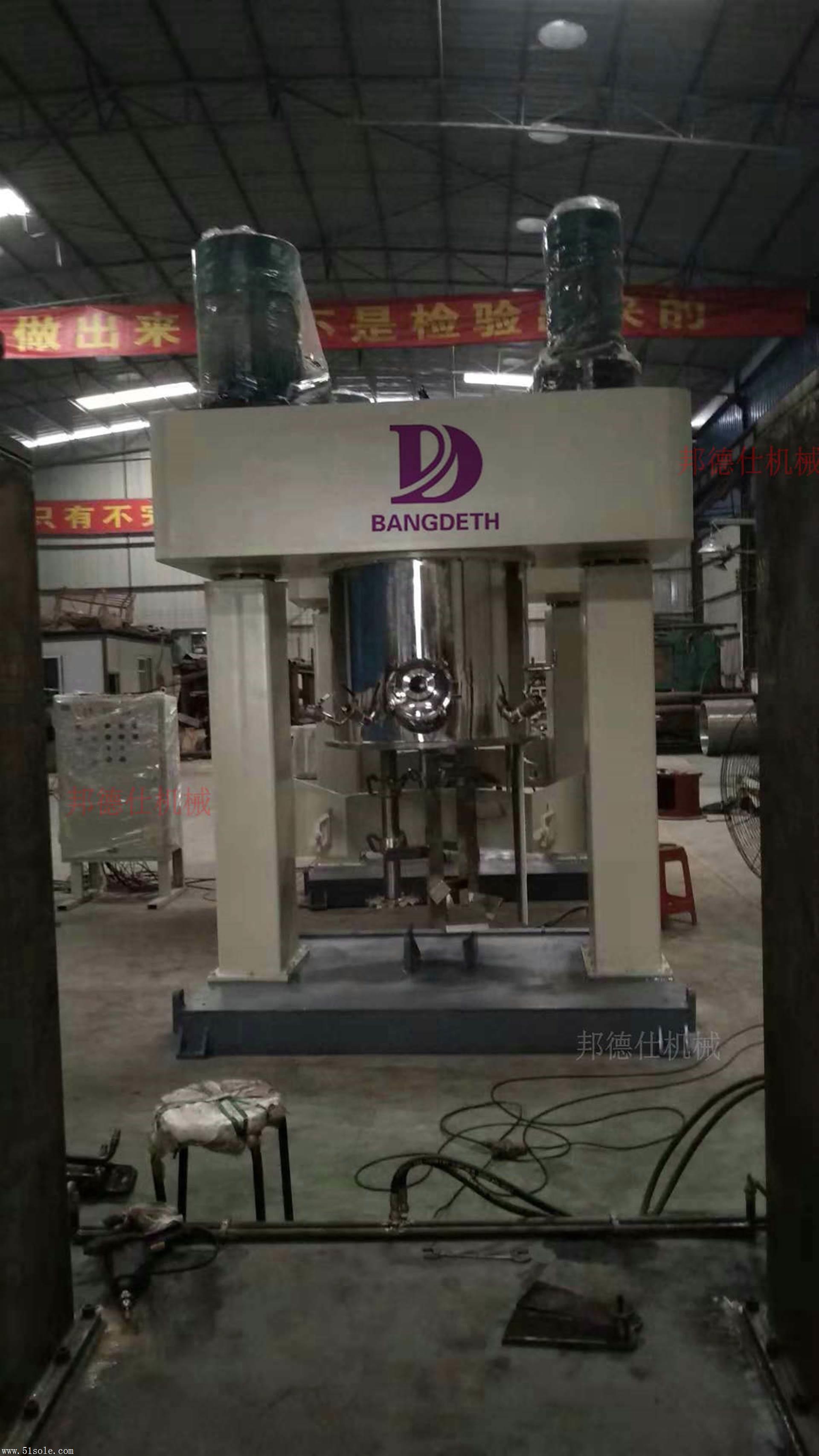 工作原理:双行星搅拌机由减速电机,行星架,搅拌器,挂壁器,铲斗,油压提升系统和机架构成。。行星架旋转时,它绕着料筒的轴线旋转,同时驱动盒中的两个搅拌轴(运动常常相交),它高速旋转,因此物料受到强烈的剪切和捏合。达到充分分散混合的目的。